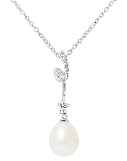 Wirbelhalskette aus Rhodiumsilber, Zirkonia und natürliche perlweiße Birne, Süßwasserperle
