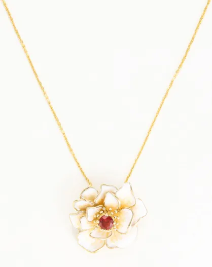 Anhänger aus 0,35 kt Granat mit extravaganter Blume und emailliertem Gelbgold