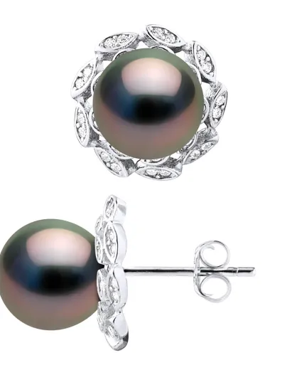 Silberne Blumenohrringe, Zirkonia und runde Tahitiperlen