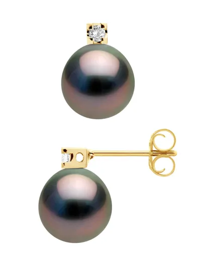 Ohrringe aus Gelbgold, 0,04 ct Diamanten und runde Tahitiperlen