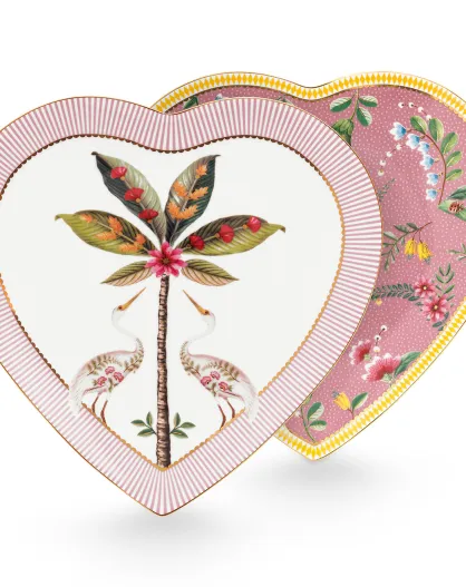 2 rosafarbene Herzteller aus Porzellan von La Majorelle, 23,2 x 24 cm