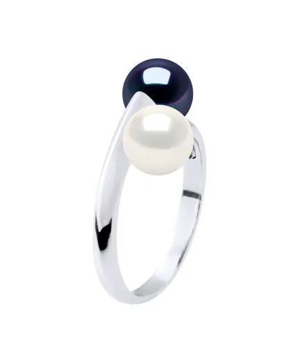 Verstellbarer Ring von Toi & Moi aus Silber und Süßwasserzuchtperlen, weiße Perle/schwarzer Tahiti