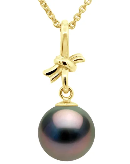 Tahiti-Zuchtperlenanhänger aus Gelbgold mit Schleife und Regenbogen