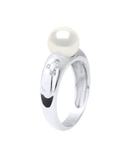 Gebogener Armreif aus Weißgold, 0,06 ct Diamanten und Perlmutt, runde weiße Süßwasser-Zuchtperle