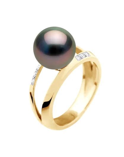 Offener Armreif aus Gelbgold, 0,06 ct Diamanten und schwarze runde Tahiti-Zuchtperle