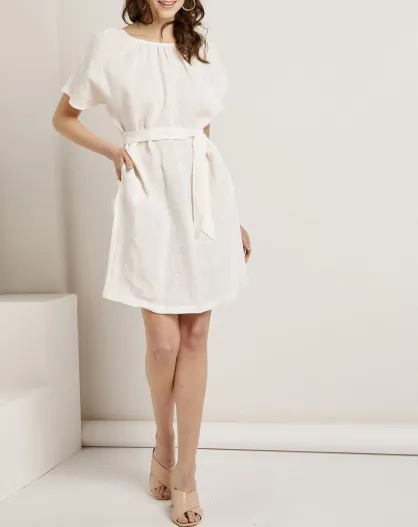 Ton-in-Ton gestreiftes weißes Zoé-Kleid aus 100% Leinen