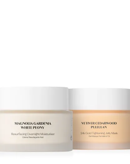 Straffende Goldmaske und Pflegeset mit weißer Pfingstrose zur Nachterneuerung