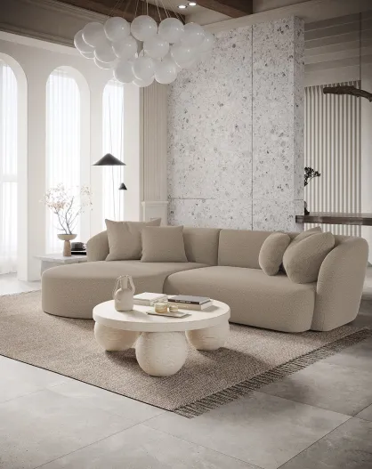 Emy linkes Ecksofa Taupegrauer lockiger Stoff - 300x155x77 cm