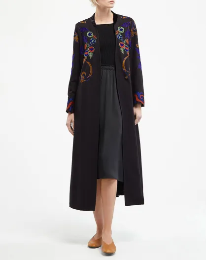 Schwarzer Mantel aus Baumwolle und Wolle mit Stickerei Musa