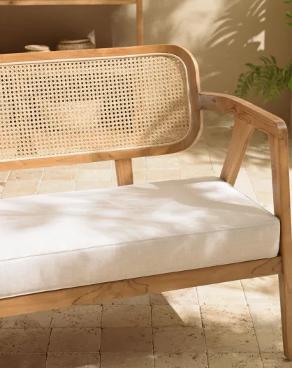 WILL - FLORES 2-teiliges Sofa aus Teakholz, Rückenlehne aus Naturrohr, graues Kissen