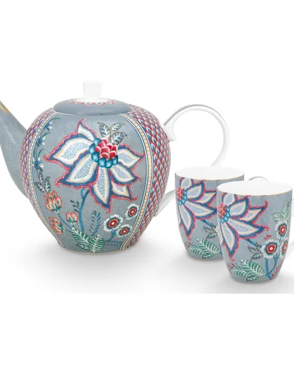 Flower Festival Tee-Set aus blauem Porzellan, 2 große Tassen und Teekanne, 24 x 18,5 x 25,5 cm