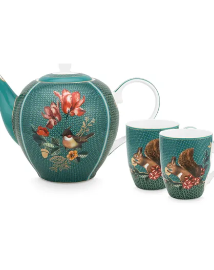 Grünes Porzellan-Tee-Set, 2 große Tassen und Teekanne, 24 x 18,5 x 25,5 cm