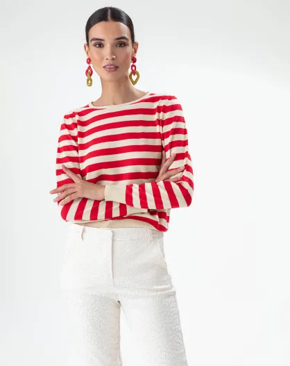 Gestreifter Pullover mit Katzenmotiv in Vanille/Zinnoberrot