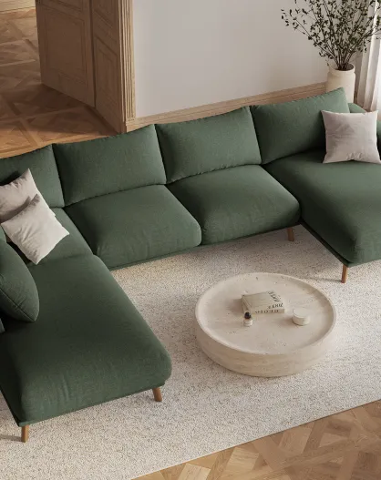 Margot Panorama-Sofa für 6 Personen, moosgrün, links offen, 365 x 235 x 75 cm