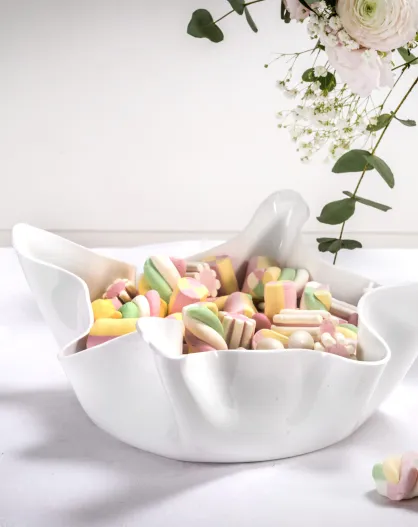 Großer Tafelaufsatz mit weißen Vorhängen