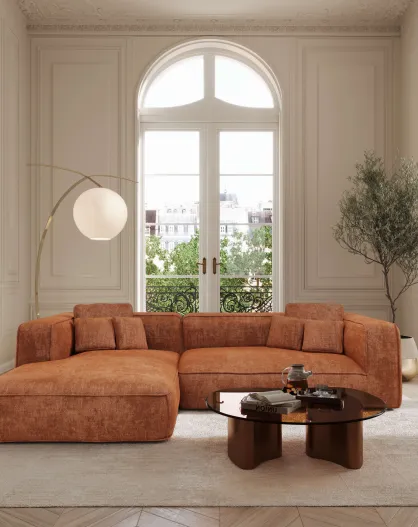 Linkes Ecksofa 280 cm ROMY Terrakotta aus geflochtenem Samt - 280x166x70