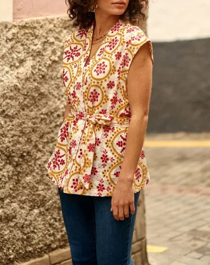 Ärmellose Samtjacke mit zweifarbiger englischer Stickerei