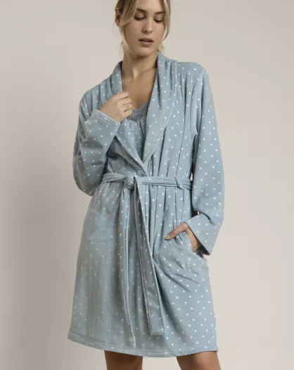 Warmer Morgenmantel mit Knöpfen, Tupfen und aquagrüner Spitze