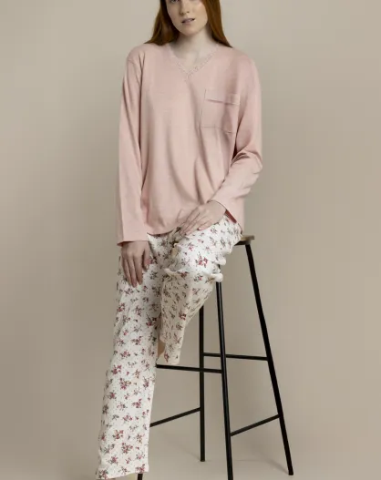 Pyjama B mit korallenroten Tupfen und Blumen