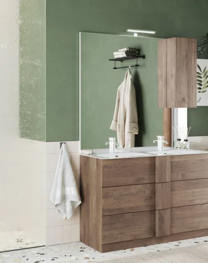 Jessie - Badmöbel auf Beinen aus Mercure-Eiche - 3 Schubladen und integriertes Doppelwaschbecken aus Keramik - 122x86x47 cm