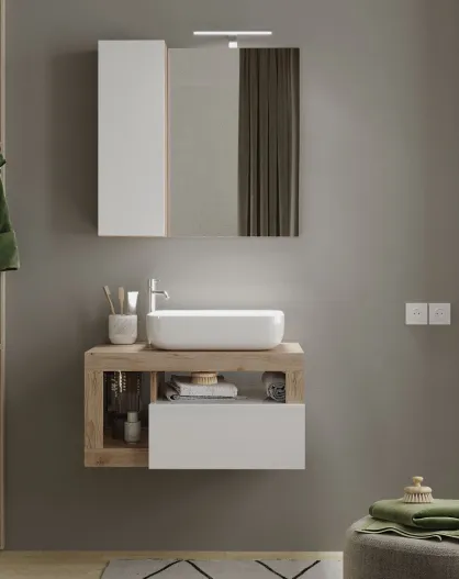 Ancona - Hängendes Badmöbel aus Kadiz-Eiche und glänzend lackiertem Kaschmir - 1 Schublade + 2 Nischen + Aufsatzwaschbecken - 79x47x49 cm