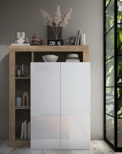 Ancona - Hochschrank mit 2 Türen, Fassade aus Kadiz-Eiche, glänzend weiß lackiert, 4 Regale, 109 x 138,5 x 30 cm