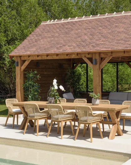 Gartenmöbelset für 8/10 Personen — 1 rechteckiger Esstisch und 8 weiße Gartenstühle mit Kissen