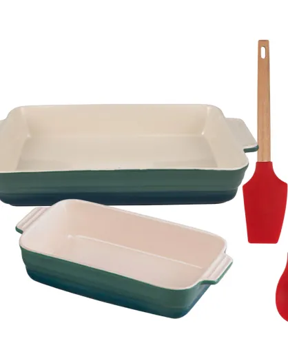 Set mit 2 Küchenutensilien: Löffel und Spatel + 2 rote/grüne rechteckige Schalen