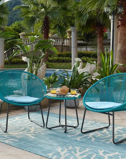 2-Sitzer-Gartenset mit schwarzen Beinen und blauen Kissen
