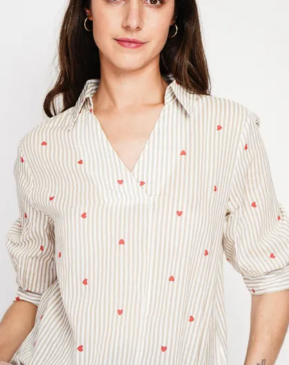 Beigefarbene gestreifte Bluse aus Leinenmischung mit Hemdkragen