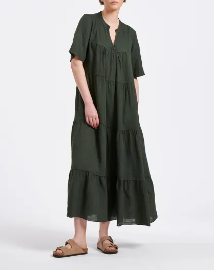 Khakifarbenes mehrlagiges Maxikleid Birmani aus Leinen