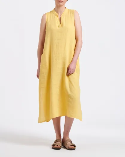 Bonita gelbes, mittellanges, ärmelloses, ausgestelltes Leinenkleid