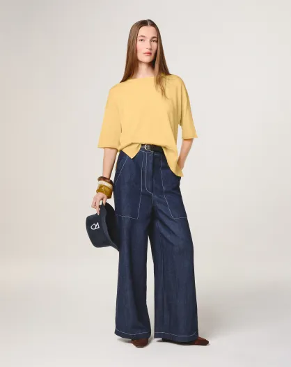 Gelber Sakura-Woll-Kurzarmpullover mit Rundhalsausschnitt