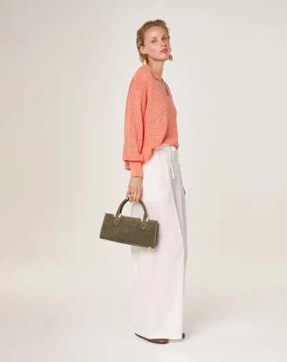 Lachsrosa Rollkragenpullover mit Lochmuster