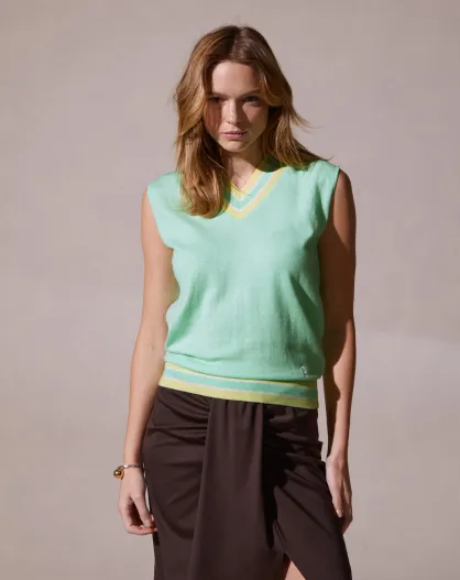 Souad blaues ärmelloses Baumwoll-T-Shirt mit kontrastierendem V-Ausschnitt