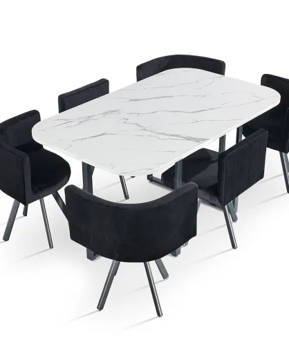 Oslo XL-Tisch- und 6-Stuhl-Set mit weißem Marmoreffekt und schwarzem Samt — 150 x 90 x 75 cm