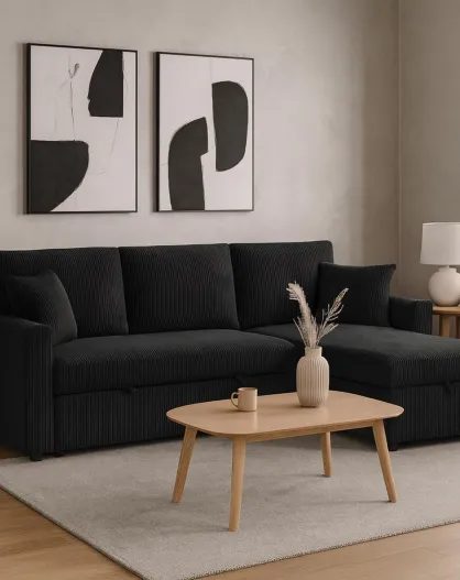 Wandelbares Ecksofa mit wendbarem Kofferraum aus schwarzem Toledo Cord - 230x143x85 cm