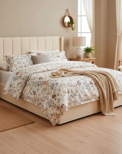 Magorial Doppelbett mit Hubgestell aus cremefarbenem Couclette-Stoff - 180x200 cm