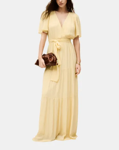 Natalia hellgelbes langes fließendes Kleid mit Rüschen