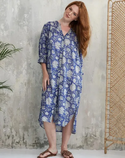 Blaues Baumwollkleid Louisette mit floralem Batikmuster