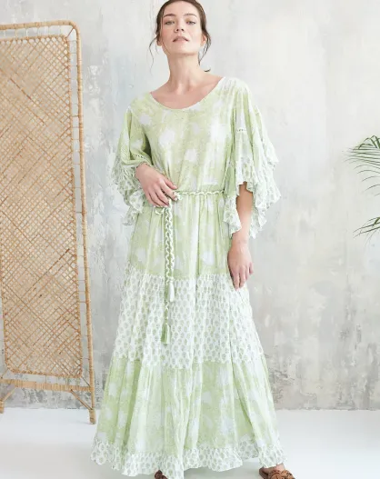 Kalyani romantisches grünes Baumwollkleid mit Blumenblockdruck