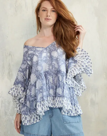 Pegan-1 romantisches blaues Baumwolltop mit Blumenblockdruck