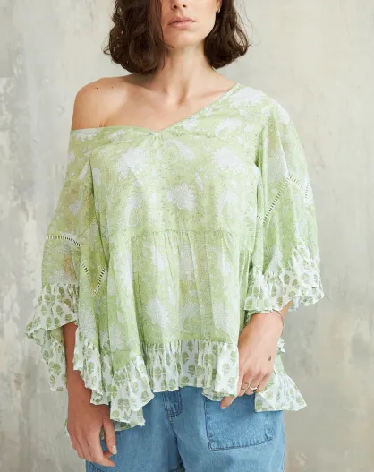 Pegan- 3 grünes Baumwolltop mit romantischem Blumenblockdruck
