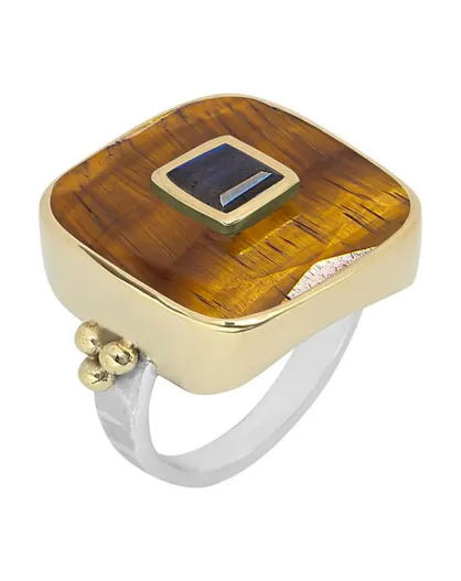 Quadratischer Ring aus Silber, Messing, Tigerauge und Labradorit