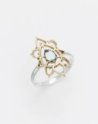 Hanie Ring aus Silber und Messing, blau getöntes Glas, Topas