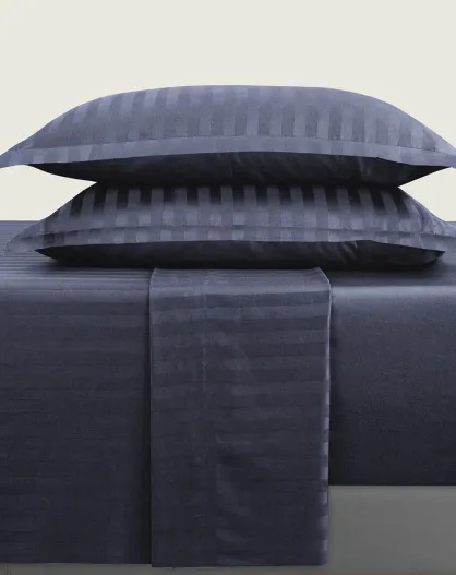 Dunkelblaues, gewebtes, gestreiftes Bettlakenset aus Baumwollsatin + 2 x (90 x 200 x 30 cm) + 2 x (50 x 70 cm)